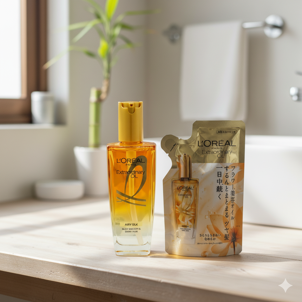 L’Oréal Paris Extraordinary Oil Airy Silk is a popular hair oil from Japan that comes in a convenient 90ml refill pouch. The formula is enriched with moisturizing ingredients and flower extracts to nourish hair from within. This leave-in treatment is designed to solve common hair issues by providing instant smoothness and shine. It helps to reduce frizziness and protect hair from heat damage up to 230°C, making it suitable for use before styling. The oil penetrates the hair, leaving it feeling soft and manageable all day with a pleasant white floral bouquet fragrance.